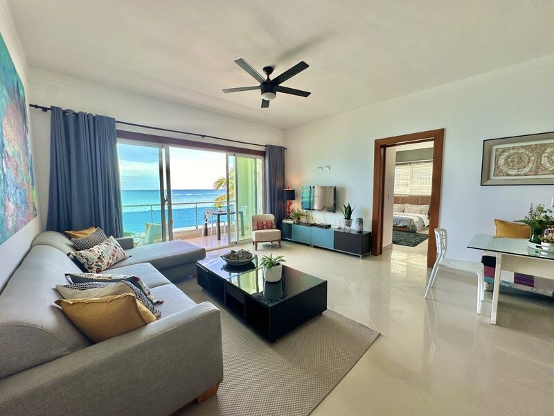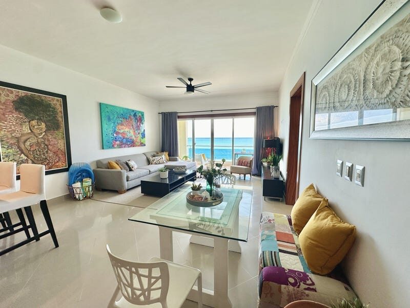 Gorgeous view from the beach 24 hours a day/ Perfectly furnished apartment in a complex on the ocean. The very center of Cabarete, Kite beach. 117.74 m2, 2 bedrooms with air conditioning, large living room, bathroom, balcons overlooking the ocean. High quality finishes, natural wood (cabinets, kitchen, doors). In the complex there is a restaurant, shops, parking. High rental rate.